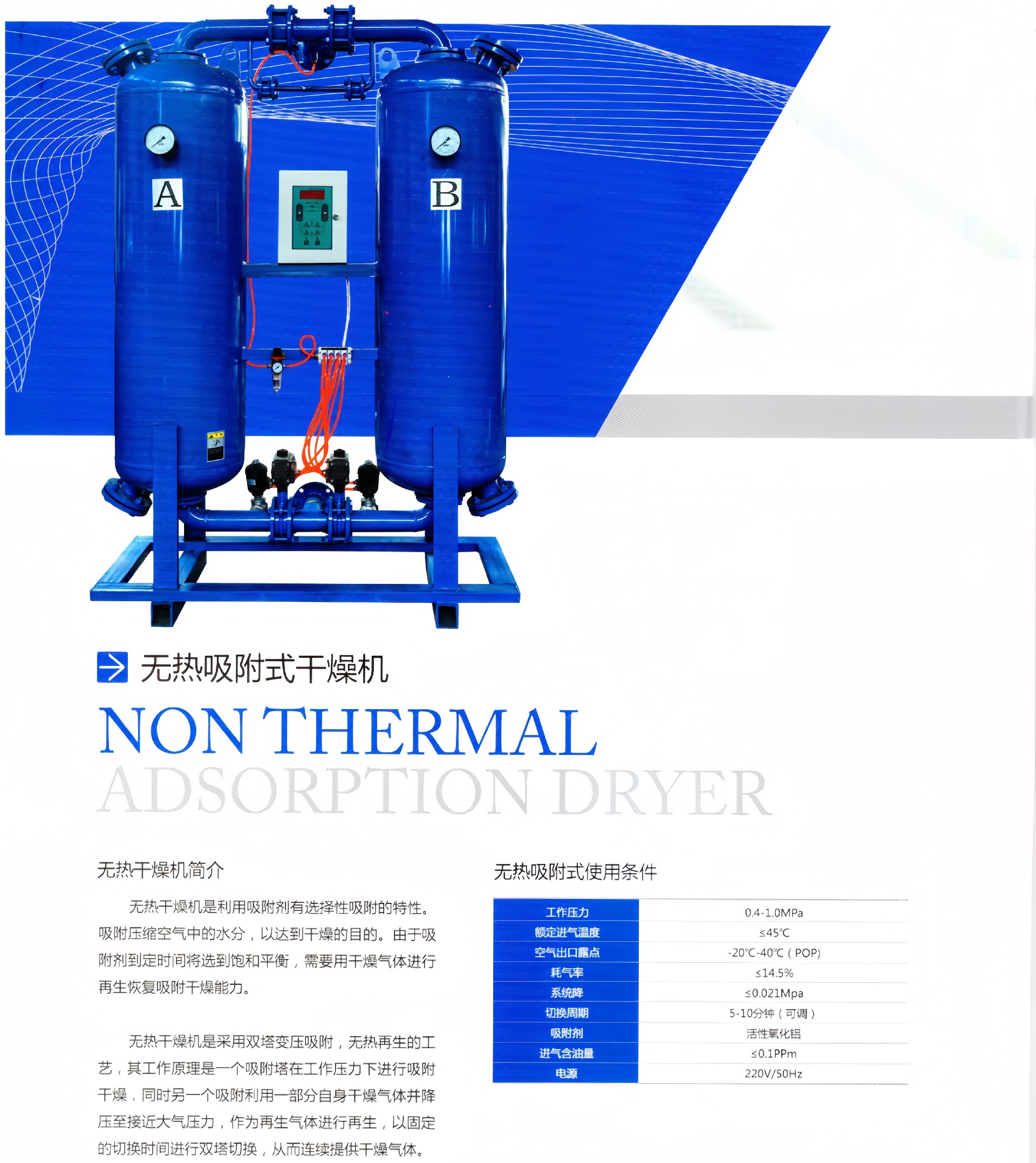无热再生吸附式干燥机是利用“变压吸附”来达到干燥效果的。由于空气容纳水汽的能力与压力成反比,其干燥后的一部分空气(称为再生气)减压膨胀至大气压,这种压力变化使膨胀空气变得更干燥,然后让它流过未接通气流的干燥剂层(既已吸收足够水汽的干燥塔),干燥的再生气吸出干燥剂里的水分,将其带出干燥机来达到脱湿的目的。